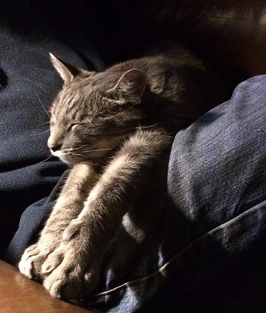 Which brings me to Simon. My daughter Lizzie found Simon, then nameless and maybe 4 weeks old, alone outside a garage on a street near her middle school. She put him in her pocket and brought him home. That was more than 12 years ago. Simon (named after the Australian actor Simon Baker whom I had a crush on back then…and still do) starts his morning—as do I—with a bowl of Fage Greek yogurt, lazes next to me in my writing room, and leaves the house several times a day to chase, catch, and eviscerate voles. It’s a life. Lizzie used to spend hours grooming him. Tom let him sleep on his lap while he read. Tom, that is, not Simon. Now Lizzie is gone, and Tom is gone, and it is just Simon and me.