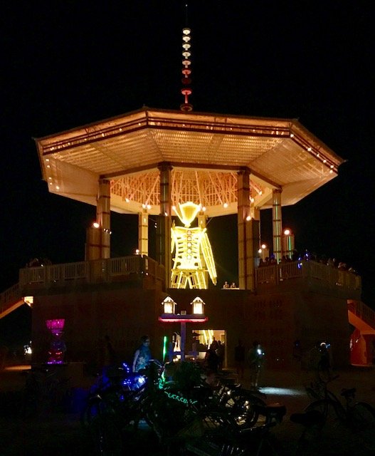 Burning Man asks the question: What would a contingent of privileged 21st century people do if they could do anything, if they were given a blank slate – the vast, stark, featureless playa – to create an instant community? The answer, as I observed as a Virgin Burner last week, is complicated. They--we--create beauty and ugliness, generosity and self-indulgence, Eden and dystopia and live for a week in a world of breathtaking sunsets and choking dust storms. Burners wash your dusty feet, take drugs, practice yoga at dawn, party all night, give away hot dogs and gin and tonics, make noise, dress in utility kilts or bootie shorts or tutus or nothing at all. They make art, big, bright, hard-edged art. They make music. They dance. They mist your scorched skin with precious water when you ride by on your bicycle. They tinker. They invent. They create something where nothing was. They make life in a dead place.But they do not live lightly on this stretch of alkali flats. They use enormous resources to create this city of 70,000: thousands and thousands of gallons of potable water delivered by trucks, thousands of gallons of gray water spirited away, thousands of gallons of gas to power the blazing Art Cars that traverse the playa every night, thousands and thousands of gallons of propane to power the generators that support each camp. Hundreds of porta potties serviced every day. This is a resource-gobbling, tech-heavy vision of the future.And mostly, despite the hugs everyone gives everyone and the gift economy (no money changes hands on the playa) and the many small kindnesses you encounter--and those you perform yourself--it is a harsh vision of the future. A post-apocalytpic vision of industrial grunge and consensual hedonism, with hulking trucks and laser beams scanning the night sky and blaring noise and too-bright lights, a Disneyland meets Las Vegas meets Mad Max world where strangers wash your naked body and you can spend an hour in the Orgasmatron on your way to watching fights in the Thunderdome.On my last morning in Black Rock City, I was riding my playa-caked Hammer & Cyclery fat-tire bike on Lustrate, the farthest from the center street, a long, dusty several mile horseshoe of a ride. I was watching the dawn clouds dissipate in the already blistering heat. On one side of me was the city, on the other, the open playa. On the playa side, there was a grizzled man riding a squeaky bike pulling a trailer with a vintage boombox bungee-ed to the frame. As he came closer, I could hear the music. It was Donovan’s "Catch the Wind." The innocence of that music, its softness, its almost silly simplicity, the gentleness of it. I stood there, straddling my bike, and I cried.