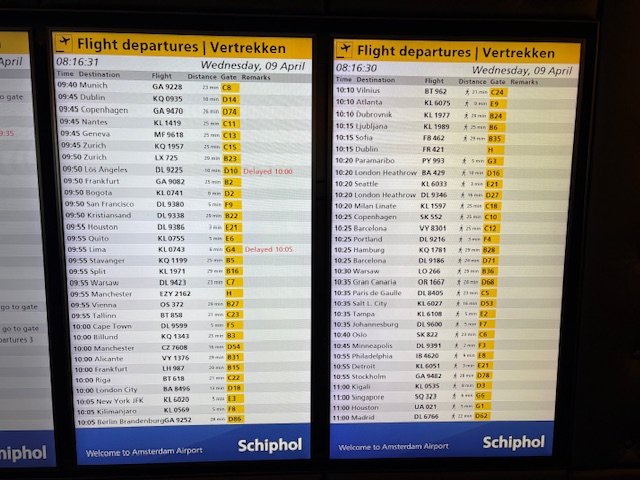 I am standing in front of the departure board at Amsterdam’s Schipol Airport, staring at the names of the cities: Quito, Warsaw, Riga, Dublin, Sofia, Madrid.