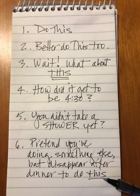 This post goes out to those of you out there who (like me) live and die by The List. Who think life can be managed by making lists. Who think lists are the pathways to sanity.Who should know better.My list for Tuesday included writing a little essay for the blog. It is now 10:15 pm Tuesday night. See that list above? I am on #6.Nevertheless, I continue to put my trust (my life) in The List. I love making lists. Even more, I love checking off items from the lists I make. Sometimes I will do something that is not on my list, and I will add it to the list just for the joy of checking it off. Oh yes, I know some of you do this too. I have also been known to make lists of my lists. Or make nonsense lists that get me out of writing thoughtful essays. Just sayin.Here is a list of the reasons I love making lists (stolen/ recycled from a post I wrote a few years ago.) Mea culpa.1. Making a list quiets the omg moments that keep me awake at 2 am.2. Making a list is a low-bar entry to actually doing whatever needs to be done. Sure, no sweat, I can make a list! It is way less scary (not to mention time-consuming) than starting the project itself.3. Lists break down huge tasks (writing a book, regaining the White House in 2020) into manageable action items.4. Lists simplify life. Whaaat? All I have to do is these 5/ 10 things!5. Lists help me think things through. They demand logic.6. Lists clear my brain. I no longer have to try to remember all this. I wrote it all down!7. Lists are finite. It may not seem like it, but my tasks are not endless!8. Lists keep me from procrastinating. Uh, Friday...and two more things on the list? Better get to them.9. Crossing something off a list = instant gratification.10. If you save your lists (um, yes, I do), they provide an historical record of your life.