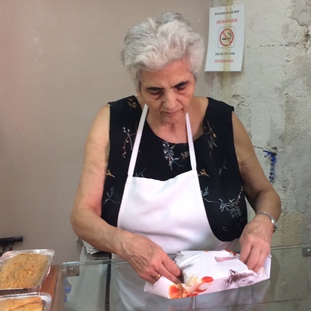 Among the many differences between life in Europe and life in the U.S., one of the most consistently startling to me is how many old people you see...everywhere: behind counters in the shops, rolling out dough in bakeries, strolling on the streets, waiting for buses, shopping in grocery stores, socializing in cafes, sitting on benches and reading the newspaper, enjoying concerts. In other words, they are a visible part of their community. A normal part of everyday life. This woman, In Rethymnon (Crete) and her husband own a phyllo bakery. They are in their 80s.