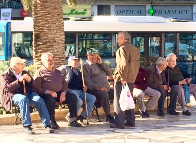 These guys are sitting on sunny bench outside the Agora, Chania's central marketplace. I sat and watched them for almost half an hour as they chatted, laughed, argued, called out to friends who passed by and generally looked like they were enjoying the morning and each others' company. And -- a big and here -- being out in the community, feeling part of the vibrant life of this small city.I think of the difference between the lives these older people live and the ones lived in the US by the elderly (and not even old old, but just retirees in their 60s and 70s). The healthy post-retirement Americans, many of them, are opting to live in gated communities among their own kind, in secluded enclaves, no longer a vital part of their families or of a multi-generational culture. Our healthy older people go to retirement "villages" that are not villages at all. Our unhealthy elderly are warehoused in nursing homes.We will never defeat ageism if we don't live together, if older people do not publicly and actively participate in their communities, if young people don't see and know and interact everyday with older people.
