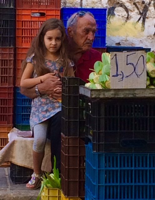 This man sells produce from his farm at the Minoos Market (Chania, Crete) every Saturday. His granddaughter -- or it could be his great granddaughter -- comes to help. When I bought tomatoes from him, he guided her to make the correct change for me.