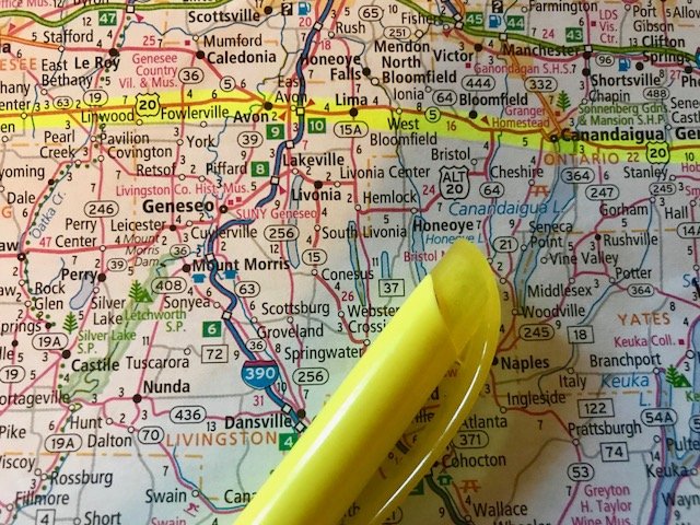 In a coffee shop in Canandaigua, New York, at the top of the Finger Lakes, I ask the guy behind the counter where I can buy a yellow highlighter pen. I’ve lost the one I’ve been using to mark our cross-country Route 20 journey in the huge Rand McNally atlas I keep wedged between the seats. Yes, of course, we have GPS. But the map is a cartographic diary. I love inking our way across the country. I feel lost without my marker.The guy gives me complicated directions to a distant Walmart that I know I will not be visiting. The fact that there is a Walmart around here is disturbing enough. We’ve been 16 days on a Walmart-free road, the road not taken, because why would anyone travel coast to coast on a two-lane highway that goes through hundreds of one-street towns (slowing down to 30 mph) when you could just zip through on a freeway.Why? Maybe the little story below helps answer that question.I go back to the counter to get my coffee, and an older man comes up to me. He apparently overheard my query about the highlighter. He tells me there’s a stationary store just down the street, but he isn’t sure they sell pens. We laugh about that. Then I sit down with Tom and enjoy the first cup of espresso-style coffee I’ve had since we happened onto a Starbucks inside an Albertson’s back when we were re-provisioning in somewheresville, Wyoming.Ten minutes later, the older man walks up to where we’re seated and places a yellow highlighter on the table. I hadn’t noticed that he’d left the coffee shop. But he had. He had walked down the street to the stationery store. As he thought, the store did not sell pens. He left. He was halfway back to the coffee shop when the storeowner caught up with him on the street, brandishing a yellow marker. “I found this in the backroom for you,” she told him.And that’s how I got a new yellow marker.And that’s what route 20 is all about.