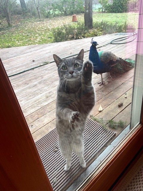 Both of these creatures, outside this morning, rush to the French door in the living room when they see me. Both stare at me. Both want to come in. Only the cat gains entry. (For those who have been around peacocks or geese or chickens…you know why.)